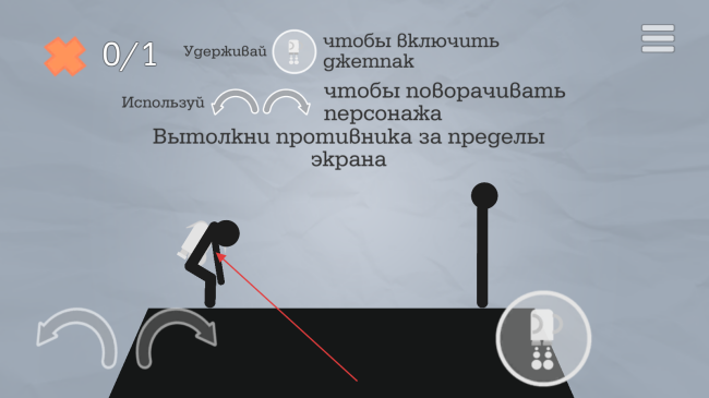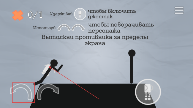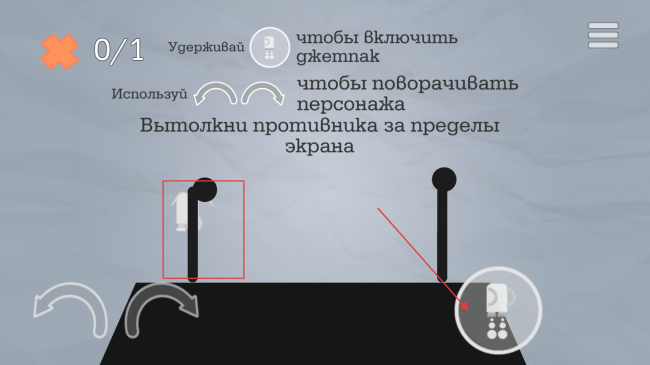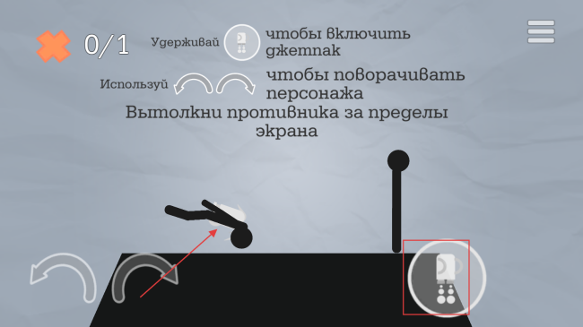 1、根据提示,长按右侧按钮可开启喷气装置,利用左右箭头按钮旋转角色,目标是将对手推出屏幕。