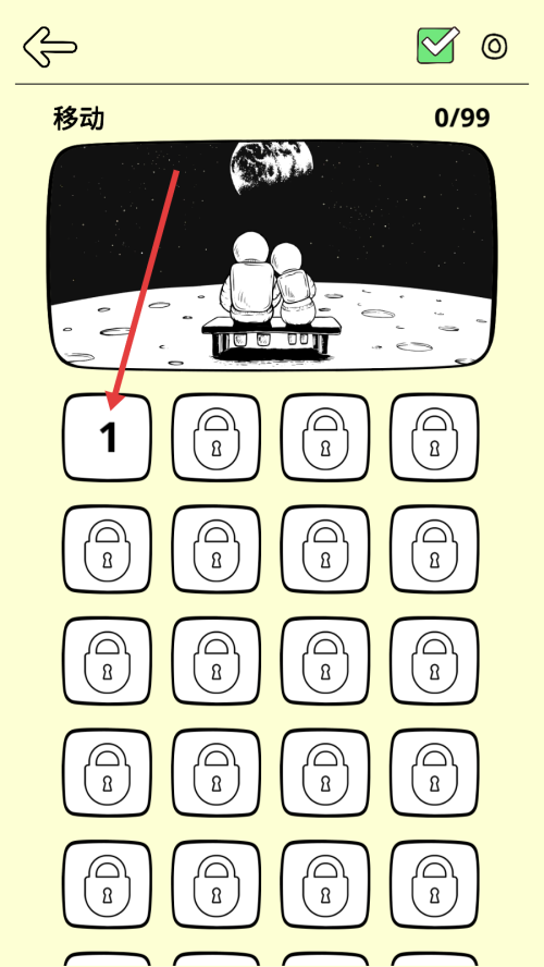 1、点击标有【1】的关卡按钮,进入第一关,开启游戏挑战,准备应对关卡内的问题。