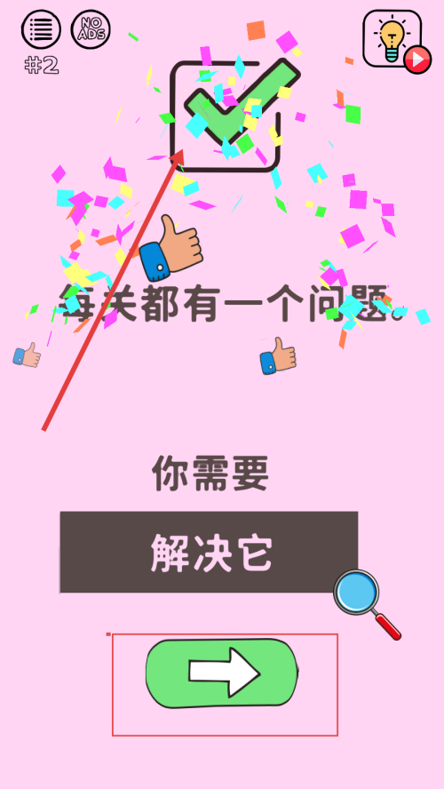 4、成功解决关卡问题后,界面出现绿色对勾和庆祝特效,点击绿色箭头按钮,进入下一关。