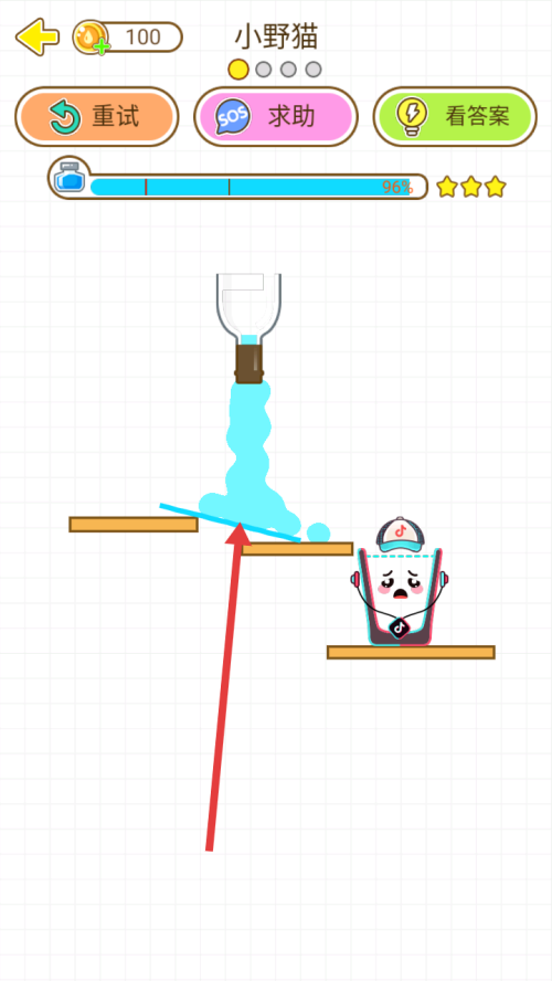 1、根据提示,在指定区域画线条,引导上方容器里的蓝色液体流动,目标是让液体进入右侧杯子,可先尝试画出合适路径。