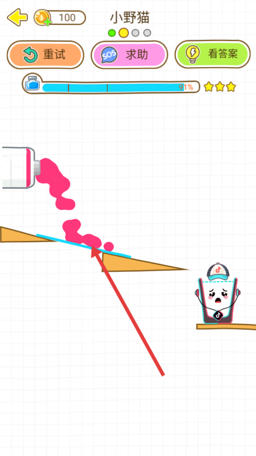 2、画出线条后,蓝色液体流出,顺着线条流动,此时需观察液体走向,若有偏差,可利用【重试】功能重新绘制线条。