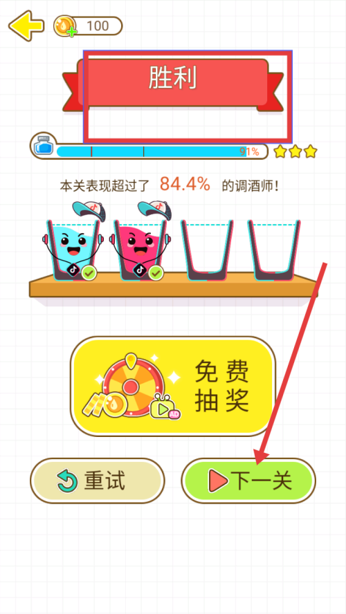 4、成功让两种液体都进入杯子后,关卡胜利,可选择【免费抽奖】或点击【下一关】继续挑战,开启新的液体引导任务。