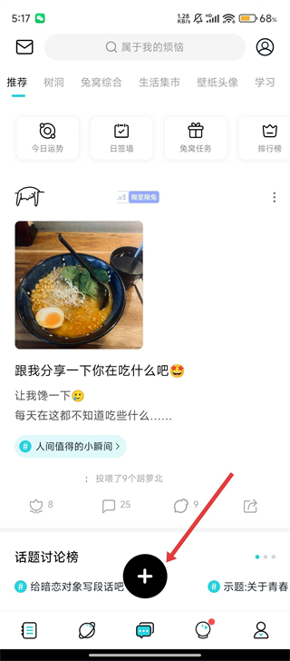 1、我们打开Moo日记后,点击底部加号按钮,准备发布帖子啦。
