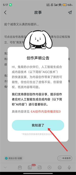 3、进入后会弹出【创作声明公告】,点击【我知道了】,即可开始编辑故事内容啦。