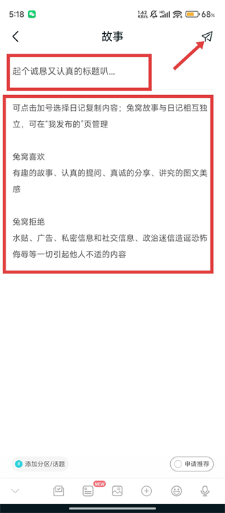 4、在故事界面,填写【标题】和故事内容,确认无误后点击发送按钮,就能成功发布帖子,分享自己的故事哟。