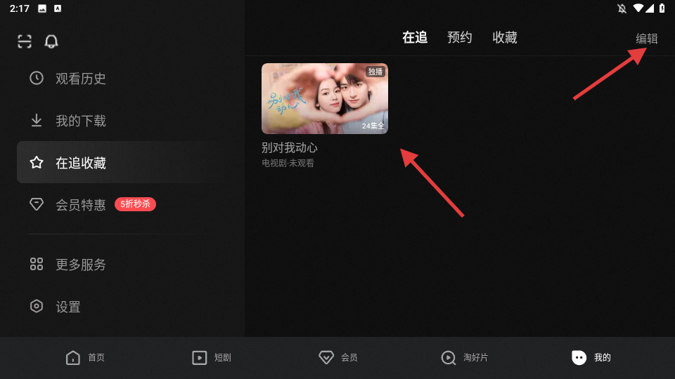 3、进入“在追收藏”页面后,可点击右上角的【编辑】按钮,进入编辑模式。