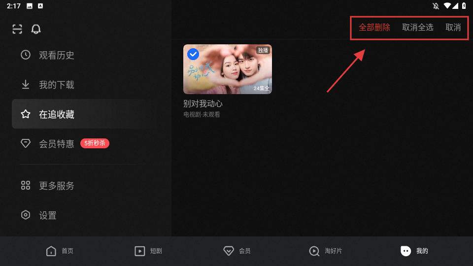 4、在编辑模式下,可选择在追的内容,点击【全部删除】等按钮,对在追收藏进行管理。