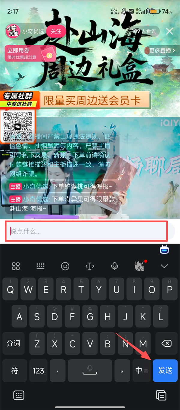 4、接着输入想发表的言论,再点击【发送】,与直播间的观众们愉快交流互动吧。