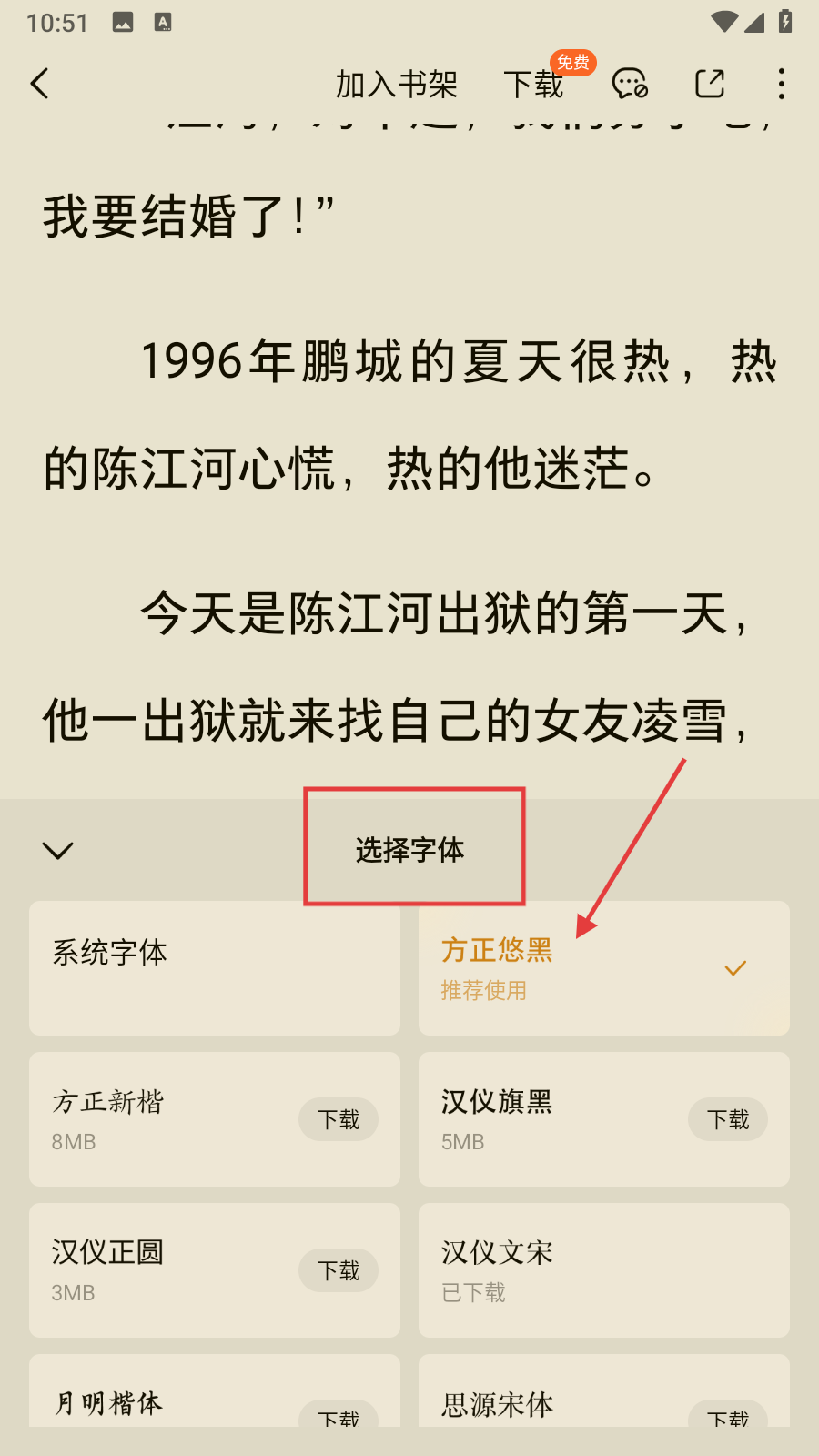 4、进入字体选择,选【方正悠黑】设为阅读字体。