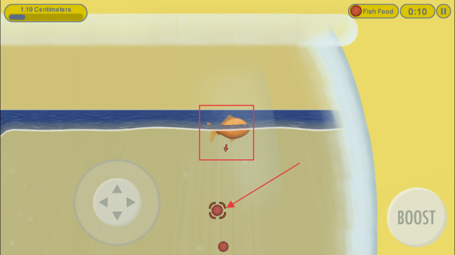 3、小鱼需要进食成长,看到红色食物颗粒时,操控小鱼移动过去吃掉,积累成长所需的营养。