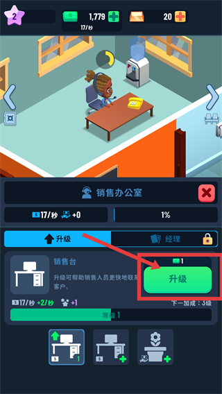3、进入销售办公室升级页,点击绿色【升级】,提升销售台等级加快客户处理。