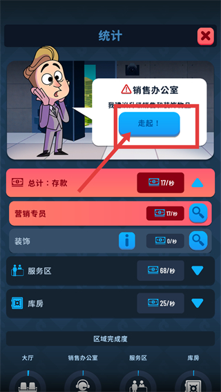 2、在统计界面,点击【销售办公室】的【走起!】,推进区域建设解锁新功能。