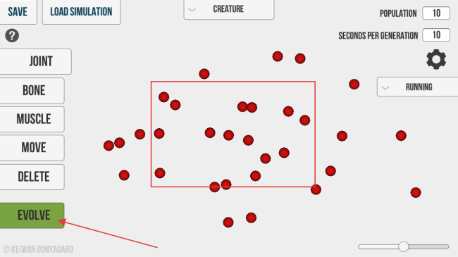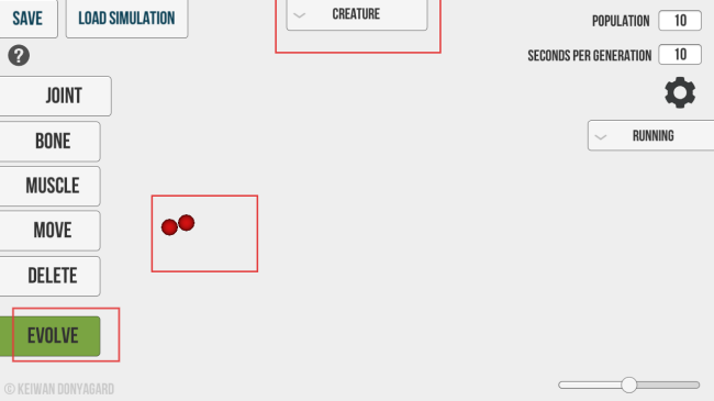 1、进入游戏,先点击【EVOLVE】按钮,让初始的红色小球开始进化,同时可查看【CREATURE】相关设置。