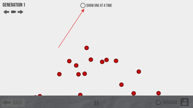 3、到【GENERATION-1】阶段,可勾选【SHOW-ONE-AT-A-TIME】,逐个查看小球,细致观察进化情况。