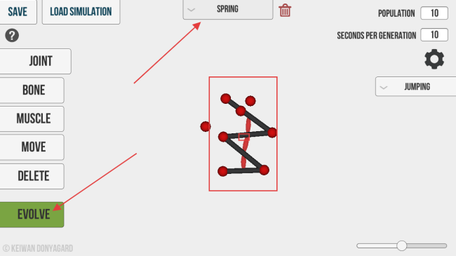 4、后续进化出结构后,选择【SPRING】类型,再点击【EVOLVE】,让带有弹簧结构的造物继续进化。