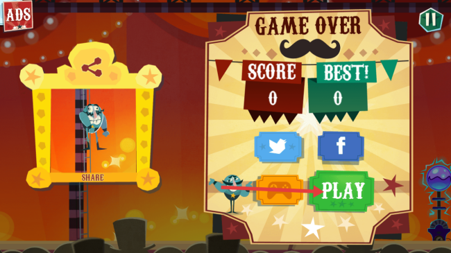 1、游戏结束后,界面显示【GAME-OVER】,若要重新开始,点击绿色【PLAY】按钮,开启新的表演。