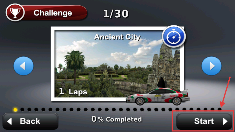1、选择【Ancient-City】赛道,点击【Start】按钮,开启1圈的赛车挑战,准备竞速。