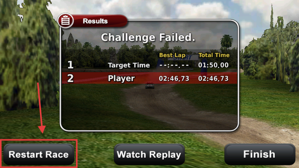 4、挑战失败后,点击【Restart-Race】按钮重新开始,优化操作争取达成目标时间。