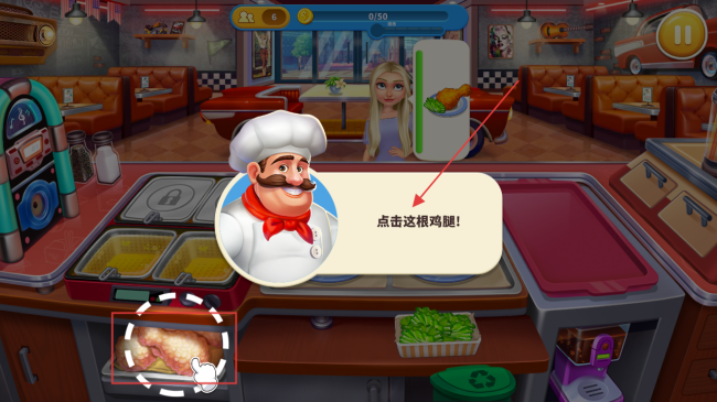 1、游戏开局,根据提示点击鸡腿,这是制作餐品的第一步,开启烹饪流程。