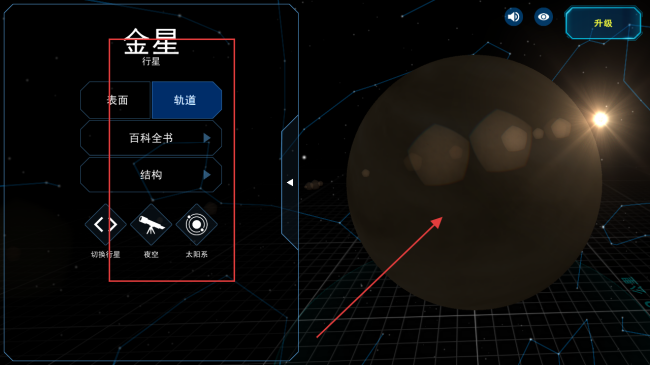 3、聚焦金星,界面左侧有“表面”“轨道”“百科全书”“结构”等选项。可点击相关选项,查看金星的轨道等信息,深入了解金星。