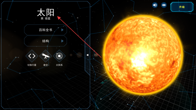 4、最后查看太阳,界面左侧有“百科全书”“结构”等选项。点击这些选项,能了解太阳作为黄矮星的相关知识,丰富对太阳的认知。