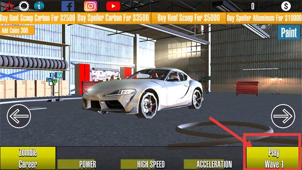 1、在车库界面,点击【Play-Wave-1】,进入僵尸主题的赛车战斗关卡。