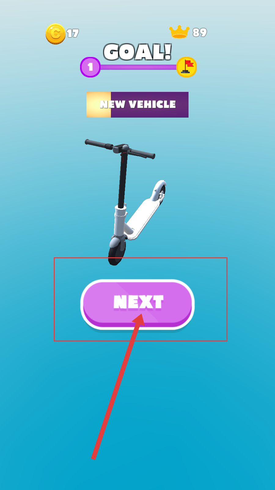 4、完成关卡目标后,点击“NEXT”按钮,进入下一关,还可解锁新的交通工具(如电动滑板车)。
