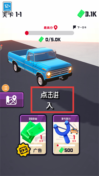 1、点击【点击进入】,进入关卡,操控蓝色卡车参与碰撞得分挑战。