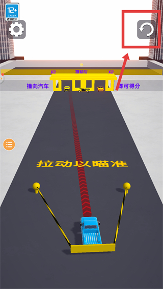2、拉动黄色装置瞄准,将卡车撞向目标汽车,进入奖励区得分。