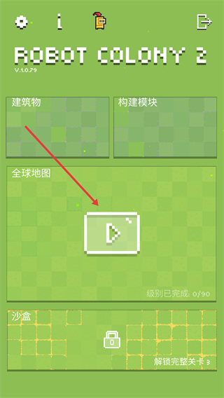1、主界面选择“全球地图”进入关卡,核心玩法是部署机器人收集资源、构建殖民地,解锁更多区域。