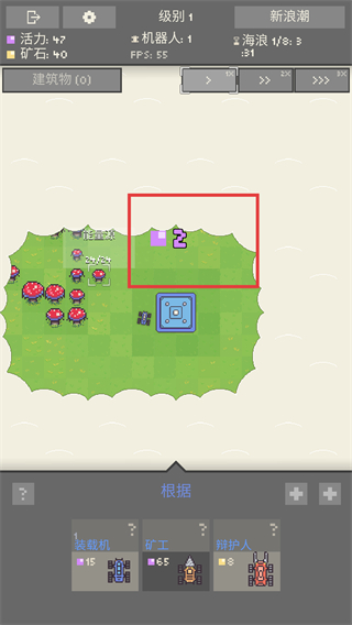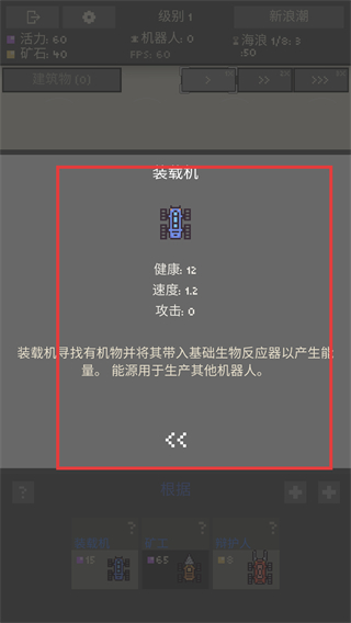 2、部署“装载机”机器人(消耗15活力),其功能是收集有机物转化为能量,用于生产其他机器人,是初期资源循环的核心单位。