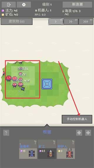 3、装载机部署后,可通过“手动控制机器人”功能指挥其移动到有机物密集区域,提升资源收集效率。