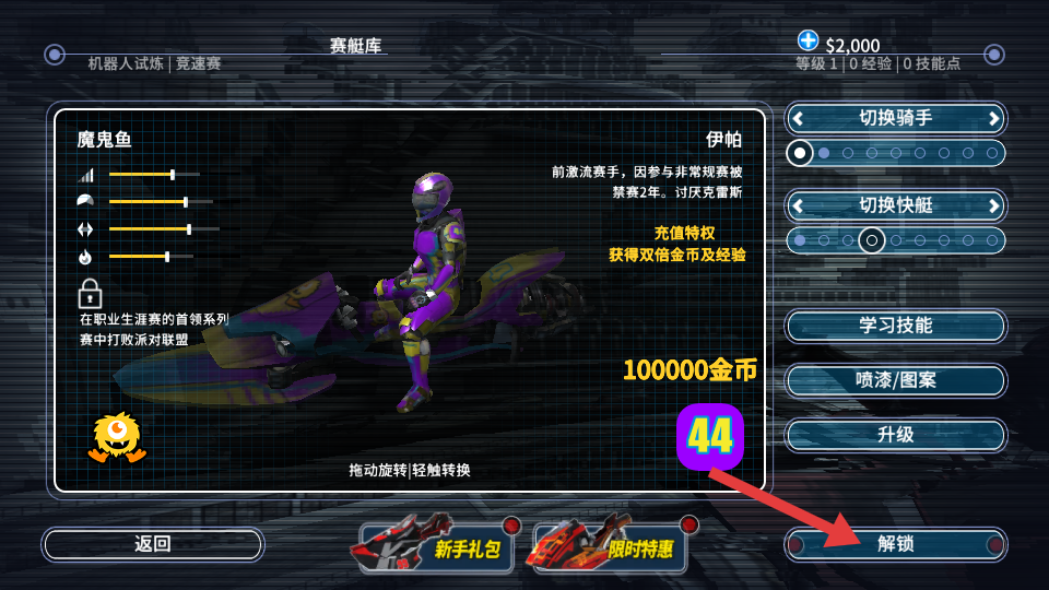 4、当有足够金币时,点击【解锁】按钮,获取新赛艇。