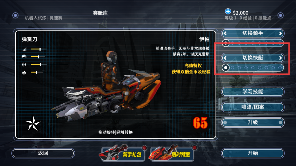 3、在赛艇库中,使用【切换快艇】按钮,选择合适的赛艇。