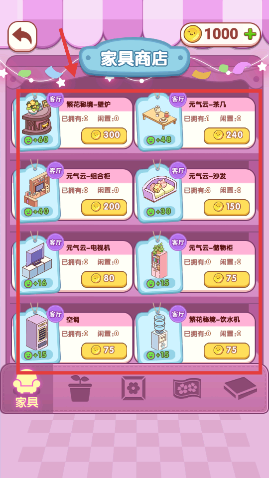 2、在【家具商店】选购,优先选择性价比高的实用家具,如桌椅、床品,满足家园基础功能需求。