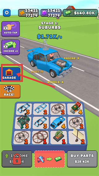 1、通过购买零件升级赛车,用两个低级零件合成更高级零件,再用零件和组件组装出参赛所需汽车。