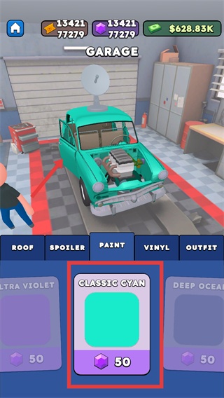4、在车库喷漆栏,花费【50】紫晶购买【CLASSICCYAN】喷漆,为车辆换色并提升相关属性。