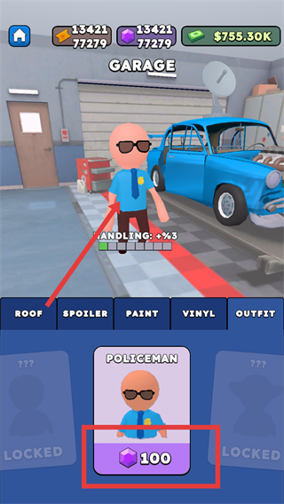 3、在车库服装栏,花费【100】紫晶购买【POLICEMAN】装扮,提升车辆操控属性。