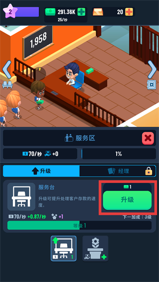 3、进入服务区界面,点击绿色【升级】按钮,提升服务台等级,加快存款处理速度。