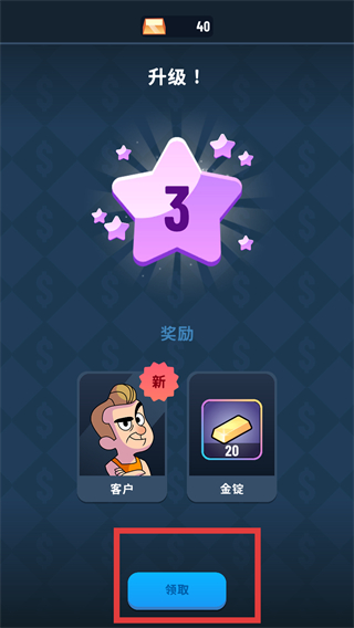 4、升级完成后点击【领取】按钮,获取新【客户】和【20】金锭,助力银行发展。