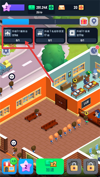 1、点击【升级1个服务台-基础】按钮,开启服务台升级任务,推进银行设施建设。