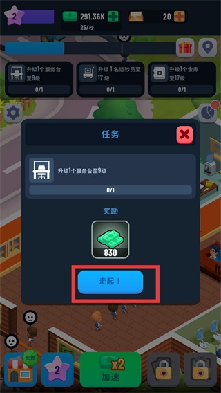 2、在任务界面点击【走起】按钮,完成服务台升级任务,可获金额奖励。