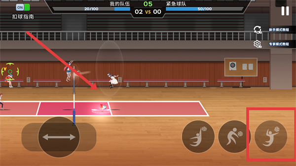 2、球落地点附近点击右侧【扣球】技能,把握时机扣球,提升得分效率。