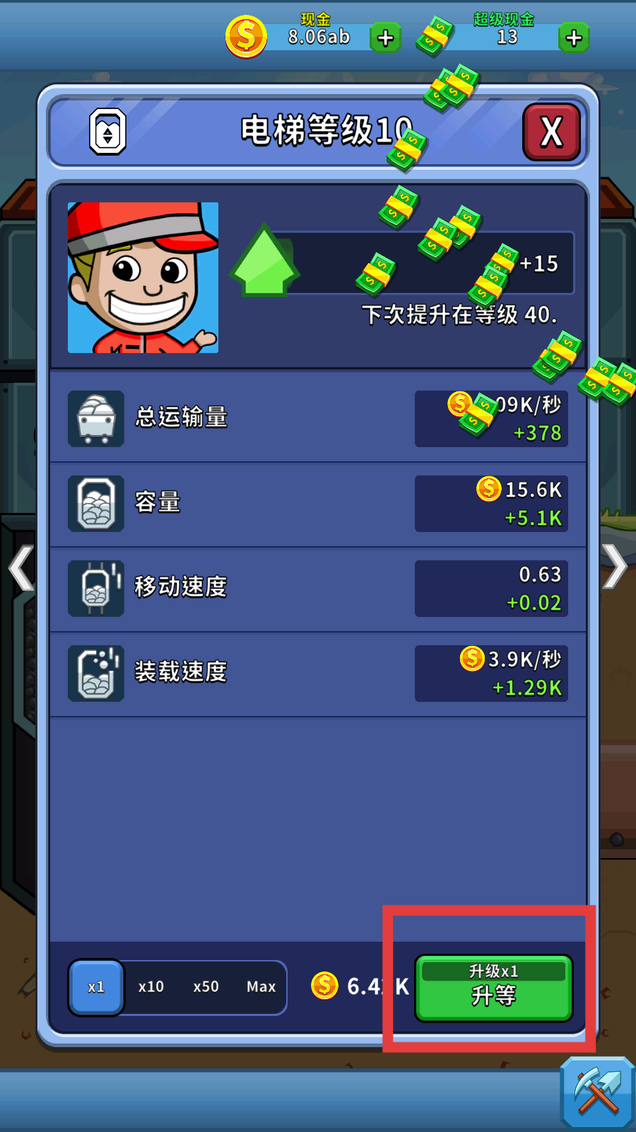 4、消耗金币点击“升级x1升等”按钮,提升电梯属性(运输量、容量等),加快矿产运输收益。