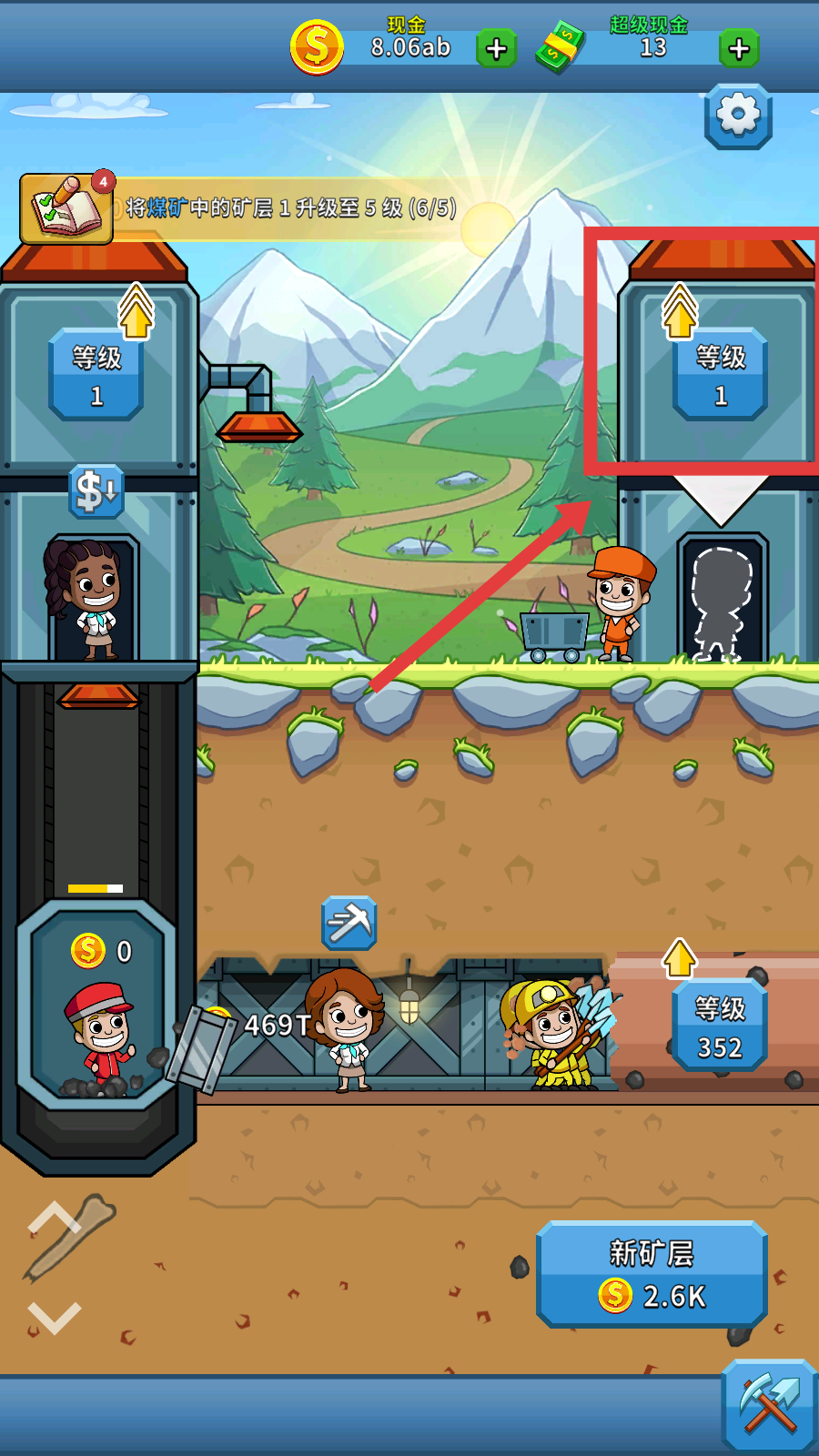 3、点击矿层建筑的等级按钮升级,完成升级任务(如矿层1升5级),提升采矿产能。