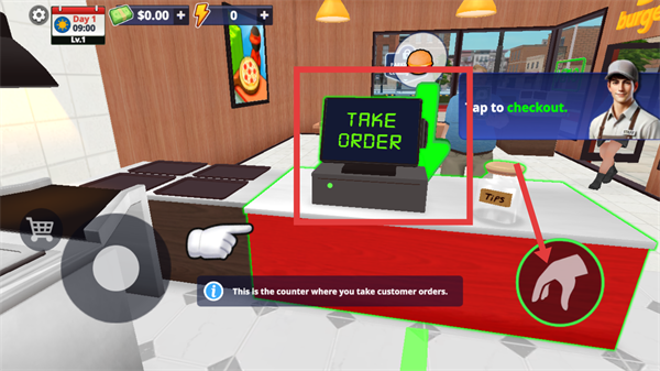 1、操控角色时,用左侧【摇杆】移动,前往收银台,熟悉汉堡组装操作,开启经营。
