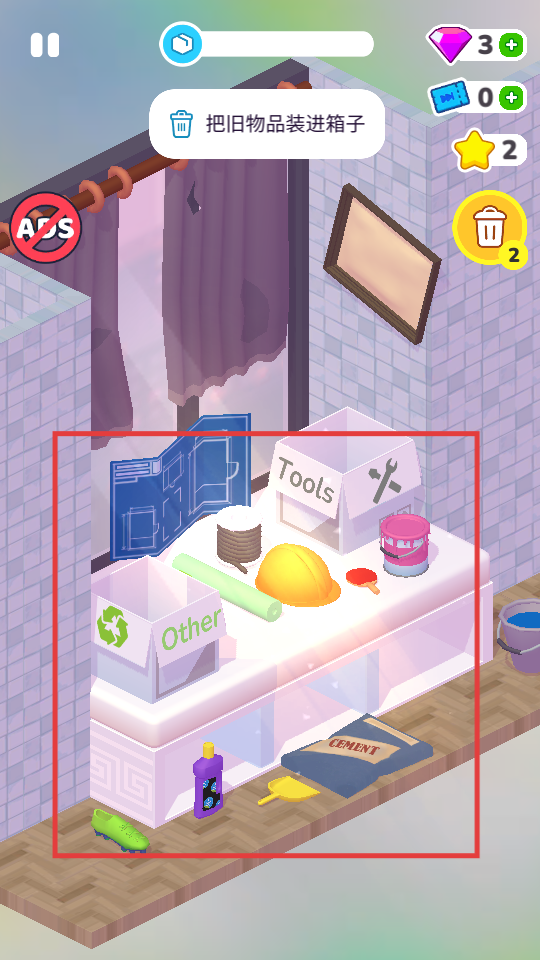 3、按照提示,将旧物品分类装进对应的箱子里,如工具类放进【Tools】箱,其他类放进【Other】箱。