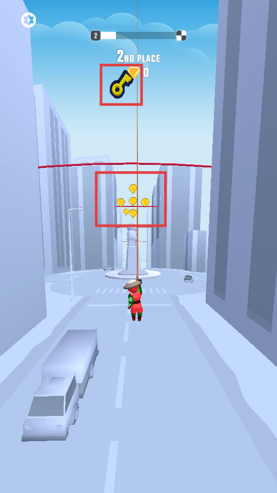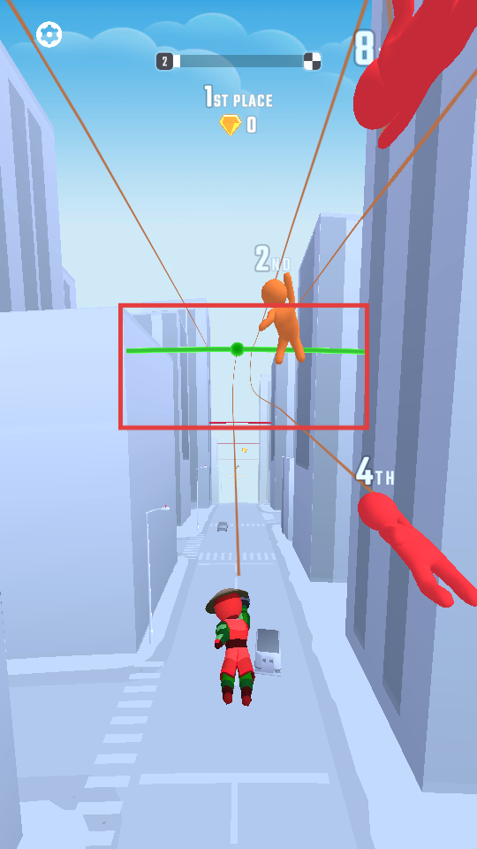 2、操控角色在绳索间摇摆前进,尽量超越其他对手,争取更好名次。