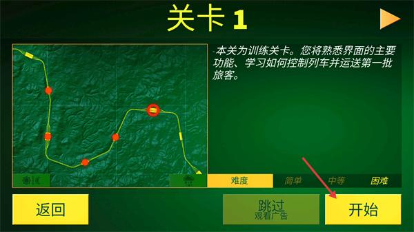 1、在【关卡1】界面选择难度后点击【开始】,本关为训练关,需熟悉界面功能并运送旅客。