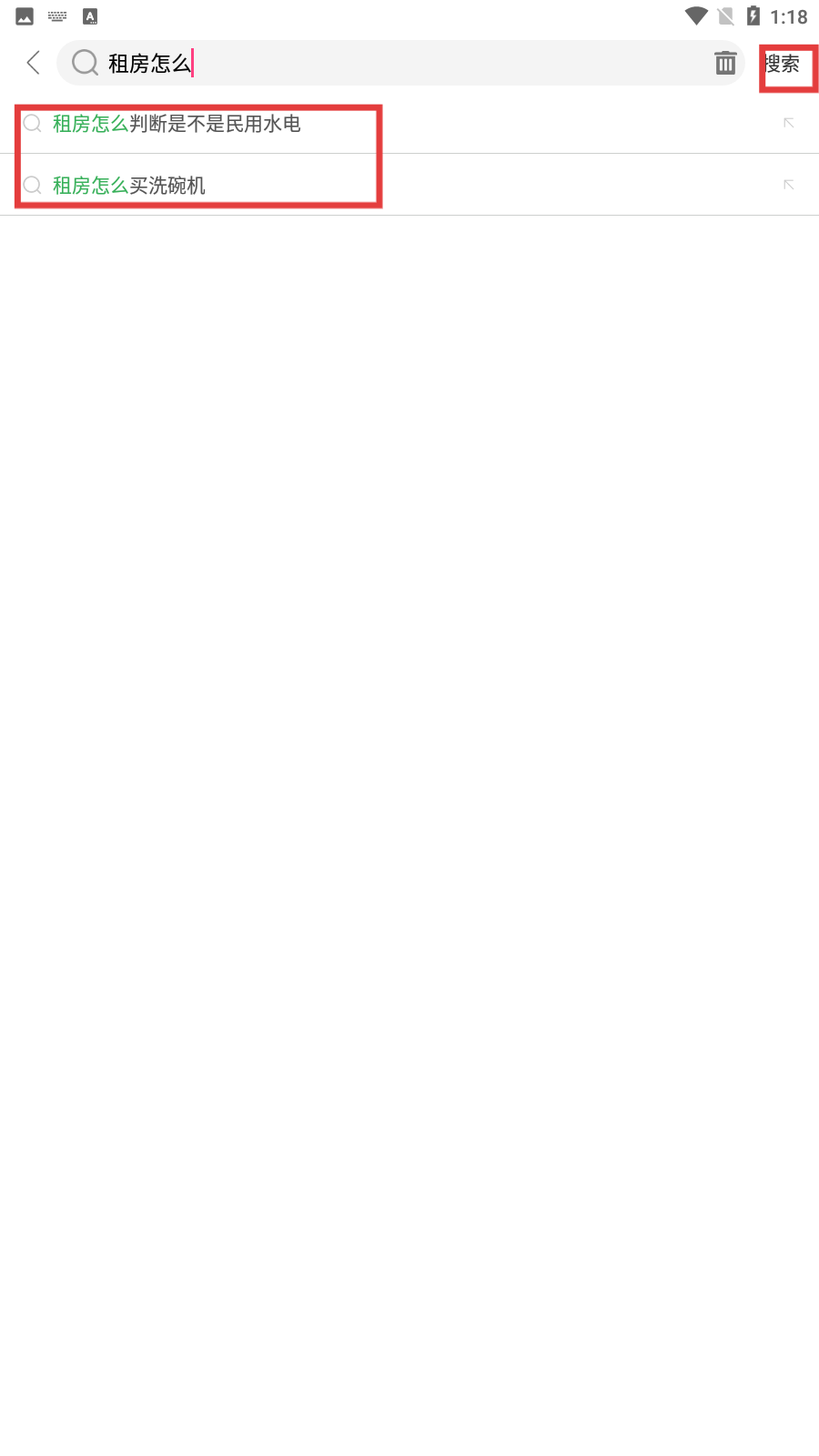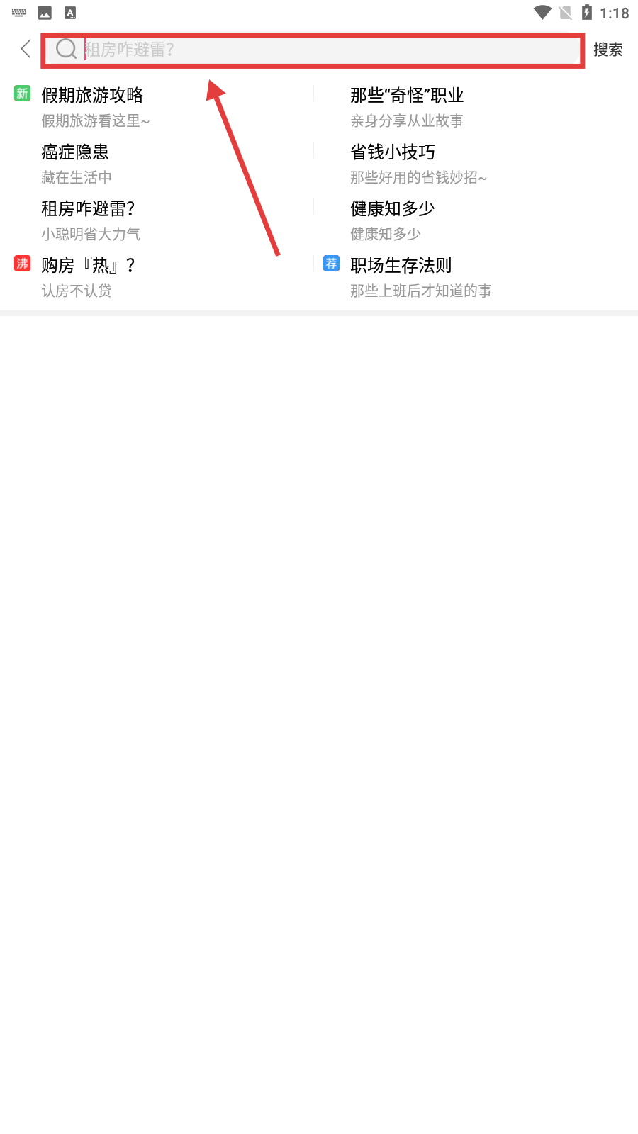 2、在搜索页面,我们点击顶部的搜索栏,输入想要查询的问题,比如租房相关的内容。